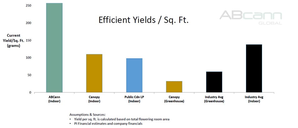 ABcann’s standardized organic growing methods yield not only a higher quality product as reflected by its premium pricing but also a lower overall cost. According to PI Financial, ABcann is able to produce almost double the industry average as measured by grams per square foot.