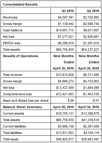 Revenue: The Company delivered on recreational and consumer branded goods market platforms, resulting in quarterly revenues of $4,597,361 million, representing a 28% increase from the previous quarter and a 40% increase over the same period in fiscal 2018.