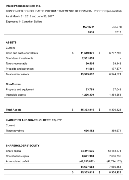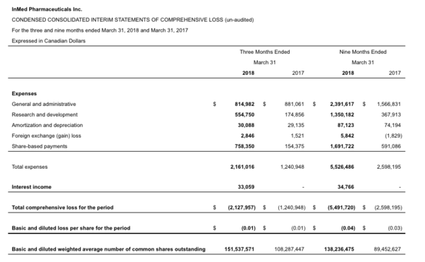 "During the third quarter of fiscal 2018, InMed continued to execute on its R&D and business strategy," stated President and Chief Executive Officer, Eric A. Adams. "InMed is making headway at establishing its leadership position as a fully-integrated cannabinoid pharmaceutical company; we are not only developing innovative therapies for the treatment of important diseases with high unmet medical needs, but are also leading the burgeoning cannabinoid sector with our first-in-class biosynthetic manufacturing technology. "Over the next several months," Mr. Adams concluded, "we will remain focused on building shareholder value via innovative scientific research and development, as well as attaining greater exposure within the investment community in the United States."