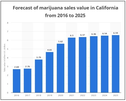 The chart below from Statista shows the major upturn in California marijuana market since it legalized recreational use marijuana: