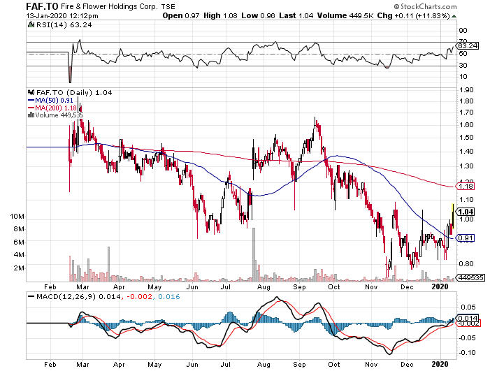 Fire & Flower is currently up 11.83% on the day to CAD$1.04.