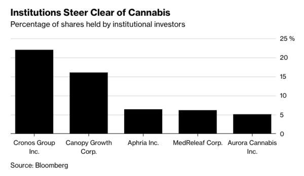 For the few cannabis companies that are cross-listed on U.S. exchanges, institutional ownership is higher. About 18 percent of Canopy Growth Corp., which trades on the New York Stock Exchange, is held by institutions, while Cronos Group Inc., listed on the Nasdaq, is at 22 percent.