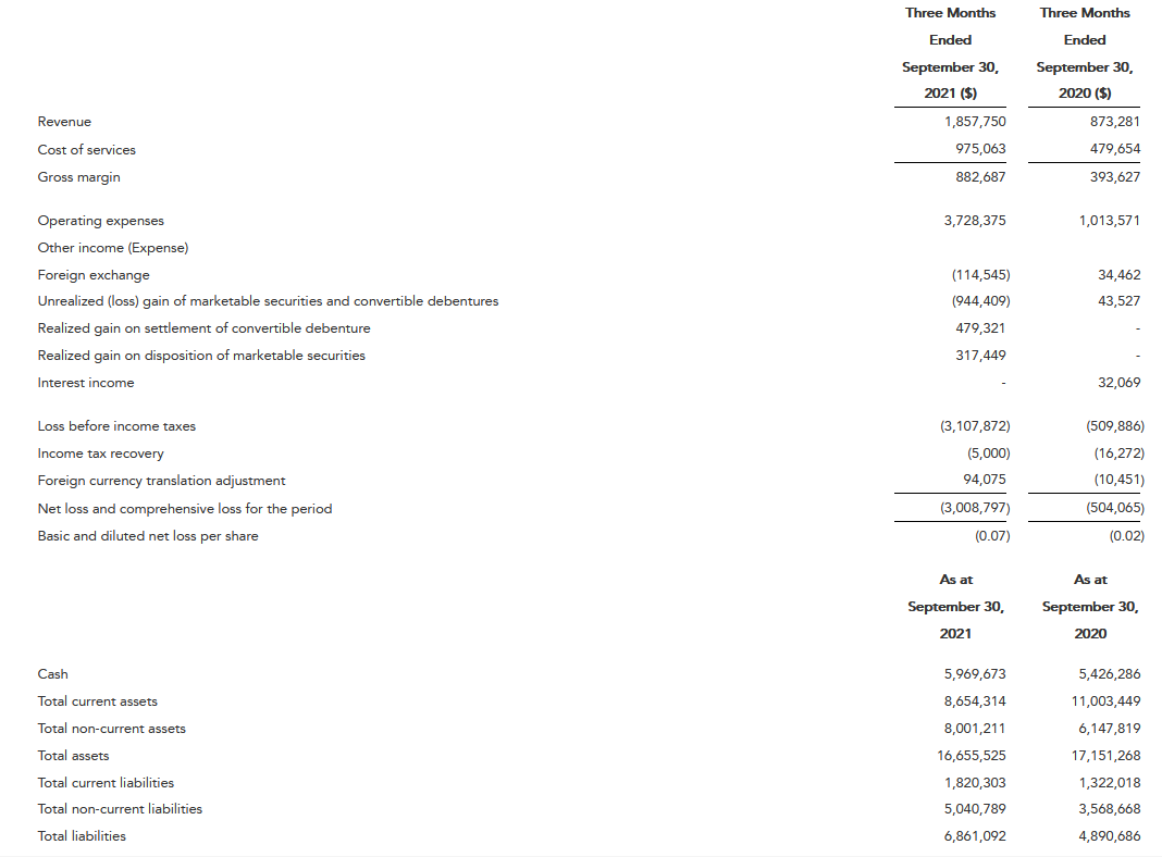 The following table presents selected financial information from Novamind's reviewed condensed interim financial statements for the three months ended September 30, 2021. The following information should be read in conjunction with the financial statements and management's discussion and analysis, which are available under Novamind's SEDAR profile at www.sedar.com.